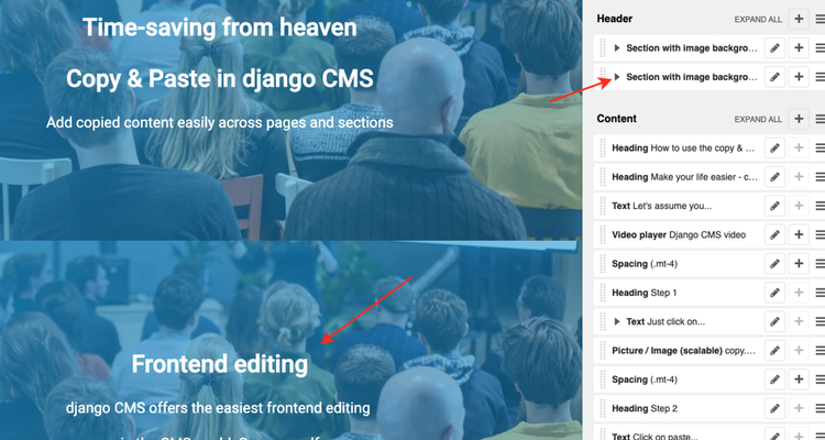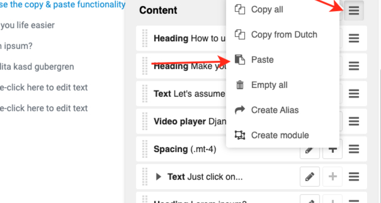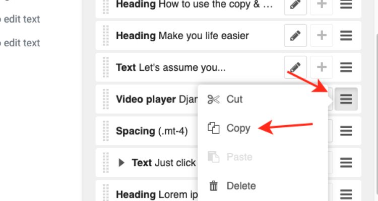 Just click on the menu button in the top right corner to open up the section sidebar. Move your cursor to the Video player plugin and click on the menu toggle icon (or as we like to say ). Select Copy and click on the hamburger button next to the Content section.